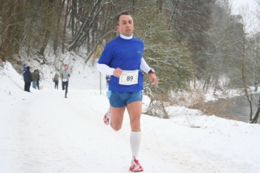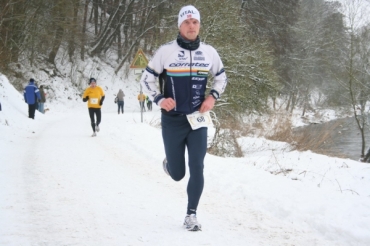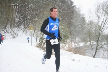Lutz Bauer (VfB Schrecksbach) läuft trotz winterlicher Bedingungen in kurzen Hosen