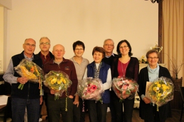 (von links nach rechts: Thomas Michalke (40 Jahre), Jürgen Wilhelm (25 Jahre), Werner Hof (25 Jahre), Gisela Schweitzer (40 Jahre), Marianne Müller (40 Jahre), Bernd Wilfert (40 Jahre), Andrea Krocker (40 Jahre), Ingrid Gastmann (50 Jahre))