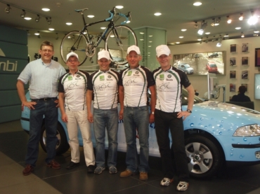 Die Breitenbacher Starter mit Gerolsteiner Teamchef Holzer (von links: Uwe Herzig, Jörg Becker, Andreas Sander, Hartmut Kühl)